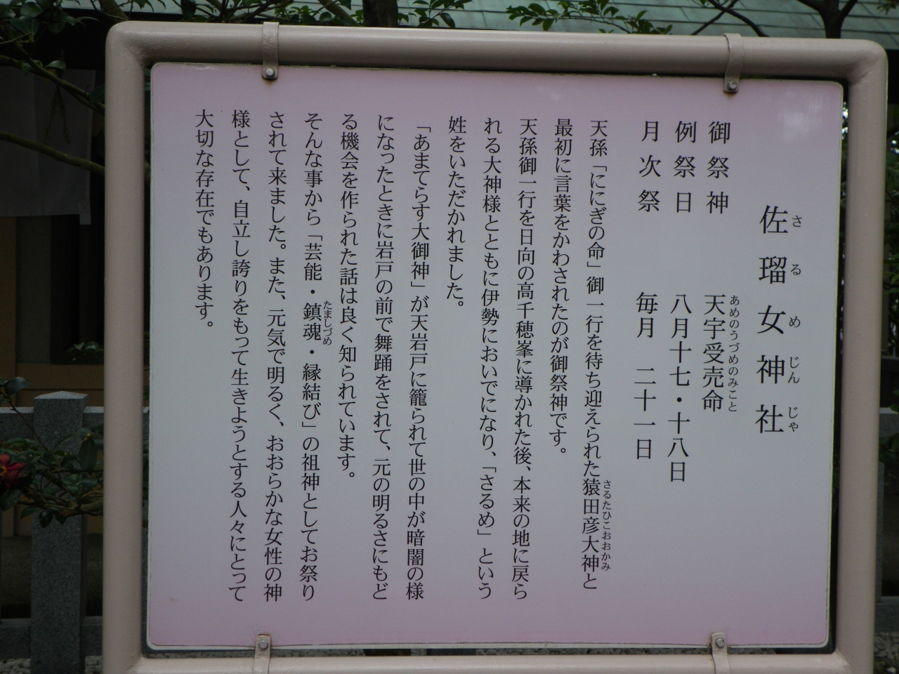 境内には「佐留女神社(さるめじんじゃ)」という神社があります。猿田彦様の奥様だそうです。あの天照大神様が、天岩戸にお隠れに成られた時に、岩戸の前で、楽しく美しく華やかに舞ったプリンシパルです。