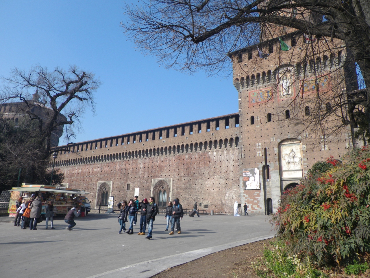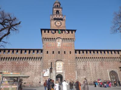 ミラノ旧市街の北西部の広大なセンピオーネ公園の入り口に建つスフォルツェスコ城(スフォルッツァ城)は、元々は14世紀にミラノを支配していたヴィスコンティ家の建てた居城だった。その後、ミラノの支配者はスフォルツァ家に移り、1450年にミラノ公フランチェスコ・スフォルツァが城を改築した。- 旅行時期