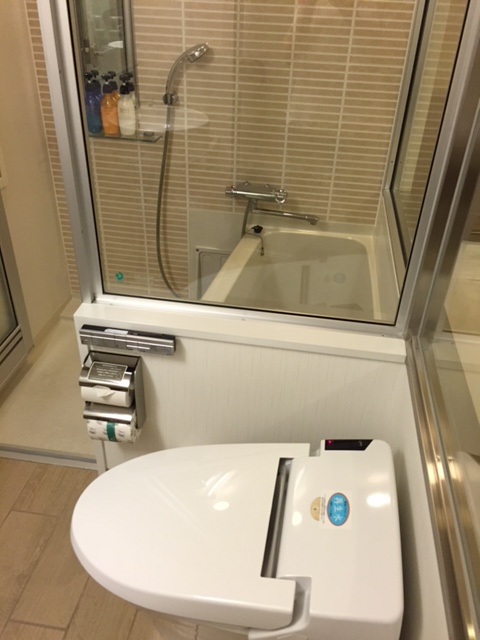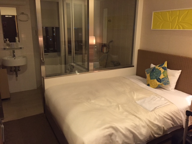 部屋に入って最初は、すぐ隣にトイレとバスが見え「落ち着かない」と思ったのですが、2泊目には慣れてしまいました。お風呂がガラス張りなので、中からテレビを見られます。