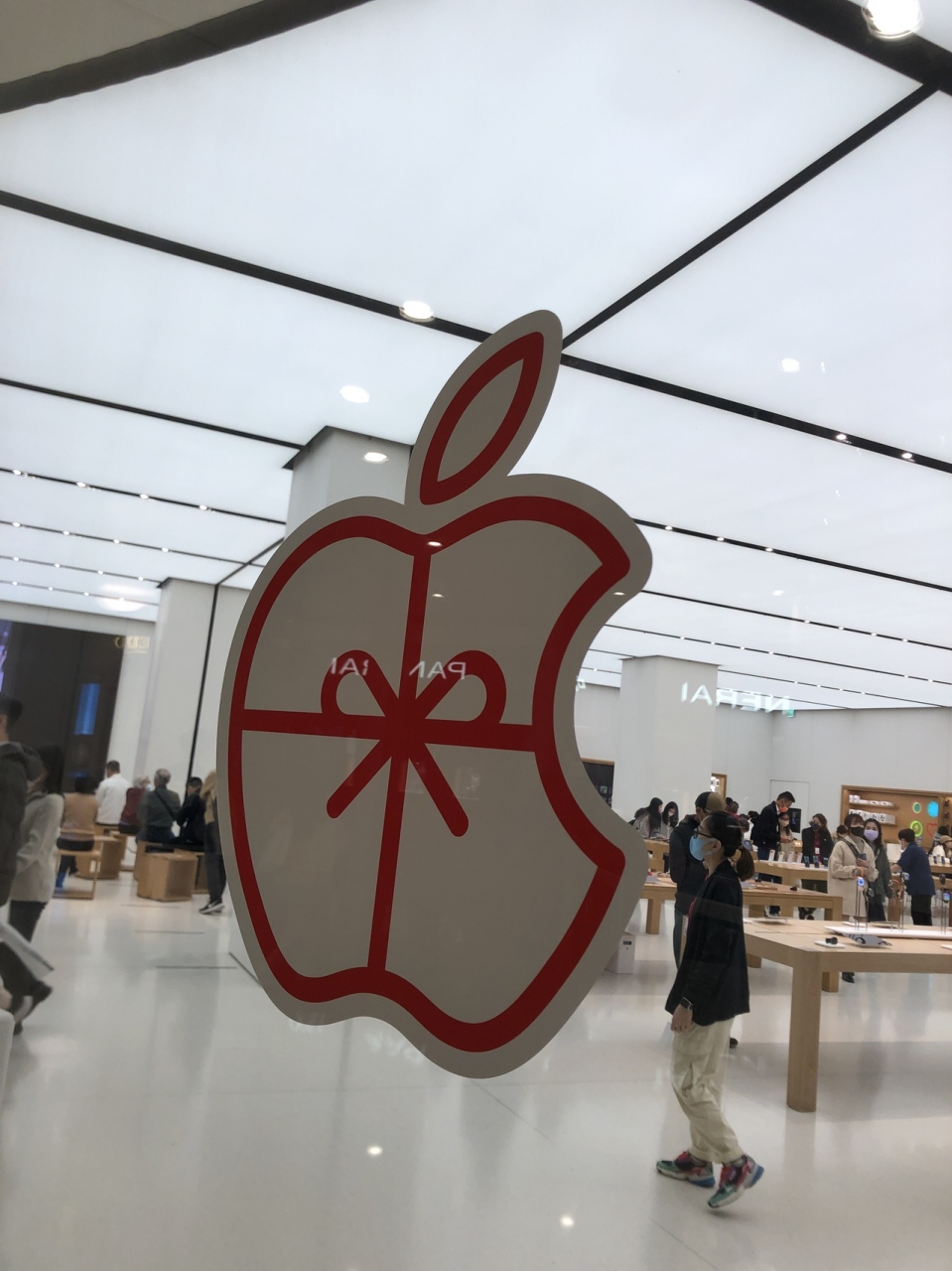 香港人は歩くペースが日本の東京みたいに速かったので、アップルストアのスタッフもものすごい速く移動していました。アップルのりんごマークが大きくて、ありがたかったです。新製品は、全部のカラーが展示されていました。