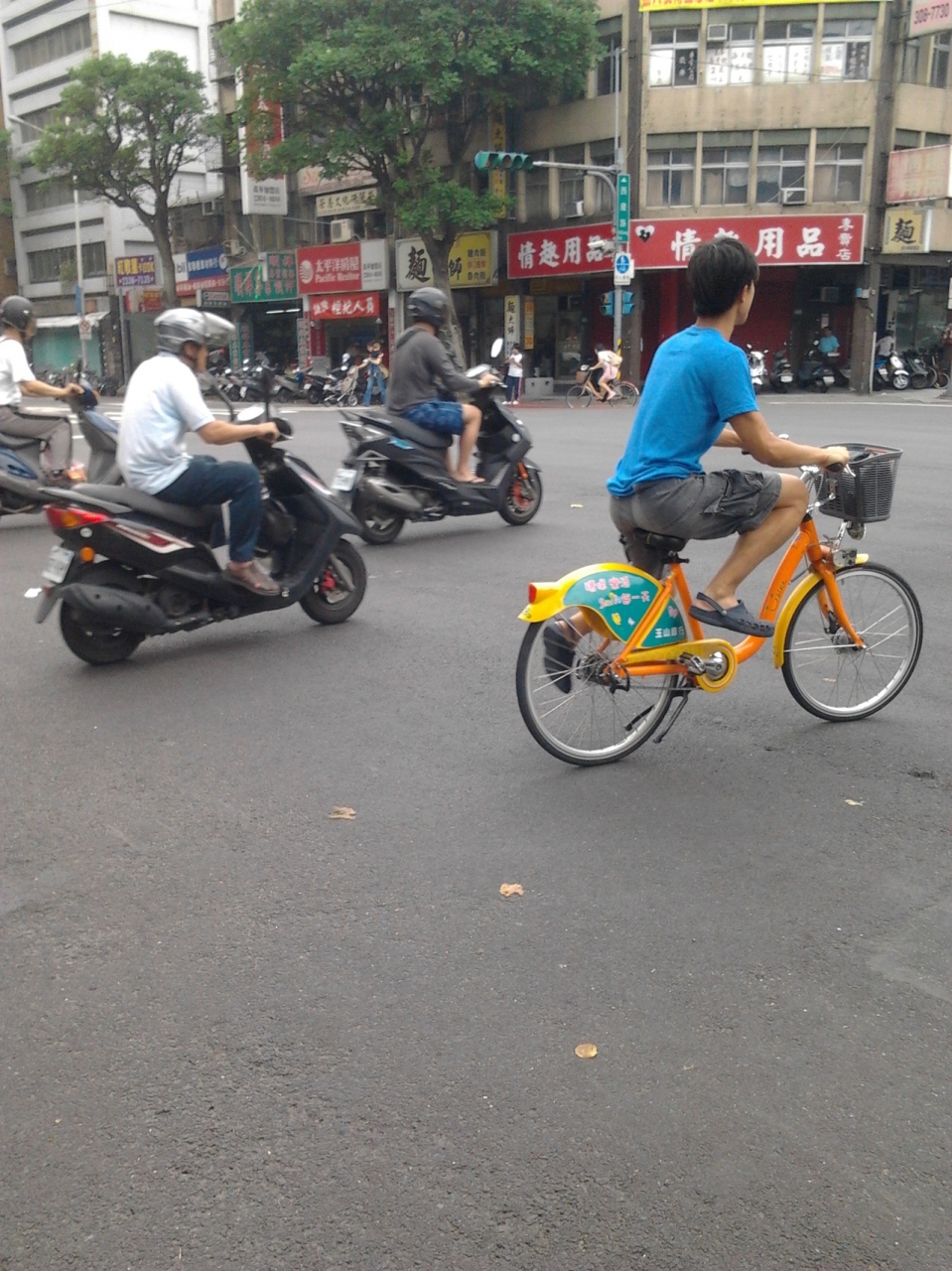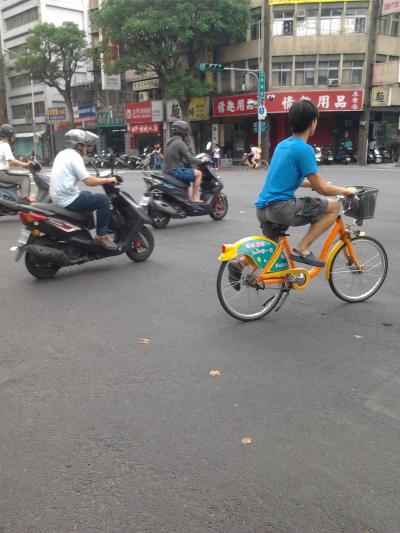 オレンジの自転車で、玉山銀行という広告とキャラのねこが入った自転車です。ユーバイクと言われているもので、ユーバイクが並んでいる場所の近くにあるステーションで自分の携帯番号とメールアドレスを入力して、MRTのカード番号も入れると、MRTのカードをかざせば乗れるようになります。お金はMRTのカードから差し引かれます。30分無料なので、ちょっと台北を移動したい時など便利です。ほとんどのMRT駅近くや公園近くにステーションがあります。一度焦ったのは、返そうと思ったら、すべての駐輪場が自転車で埋まっていて、お金がどんどん加算されて焦りました。