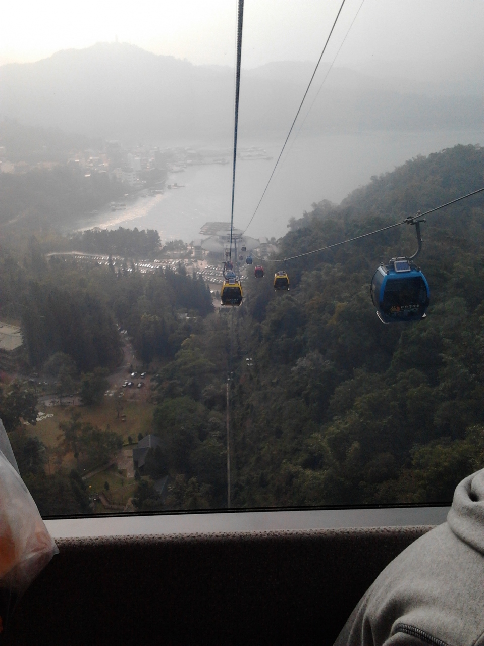 山を登っていくロープウェイ。乗り場が結構上にあるのでスロープや階段を上っていきます。日月たんに着いたら、バス・船・ロープウェイがセットになっている券を購入するのをおすすめします。窓口でうってました。このセット券にロープウェイのがあるので、それを使いました。青・赤・黄色です。色の濃い桜がさいていました。帰りは、わきがの男性が一緒だったので、密室は限界で景色どころではありませんでした。
