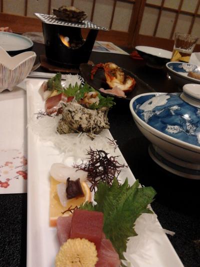 義父母の招待で、義父母と私たち夫婦と祖父母の6人で行きました。車で行ったので、駐車場に停泊。とても閑静な所でした。郵便局とイオンが近くにありました。夕食がとてもおいしかったです。あわびやまぐろなど魚介類はもちろん茶碗蒸しもおいしく、ぽっちゃりしたおばさんがお料理を運んだりさげたり、愛嬌がありました。ホテルの売店でワインのコルク?をおじいちゃんに買ってもらいました。温泉は自由に入れ、自分の部屋でも温泉が出るとのこと。