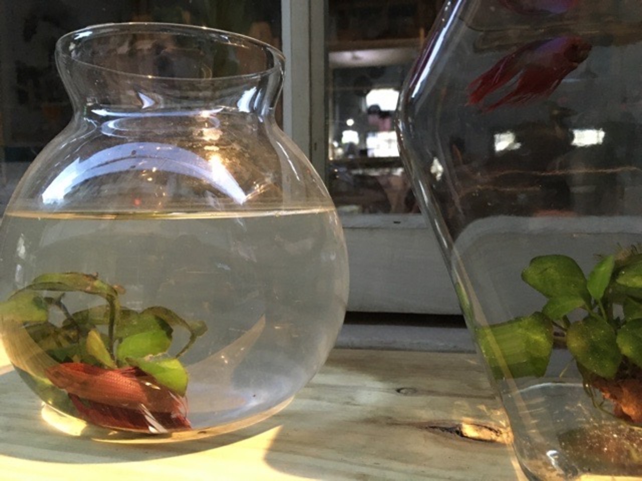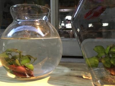 レトロな赤煉瓦の建物や嘉義駅と同じクリームイエローの建物、コンクリート打ちっ放しの建物がありました。外にガラスの水槽があって、ベタが1匹づつ入っていました。古い自転車を利用した植木鉢などもあり、サステナブルでした。