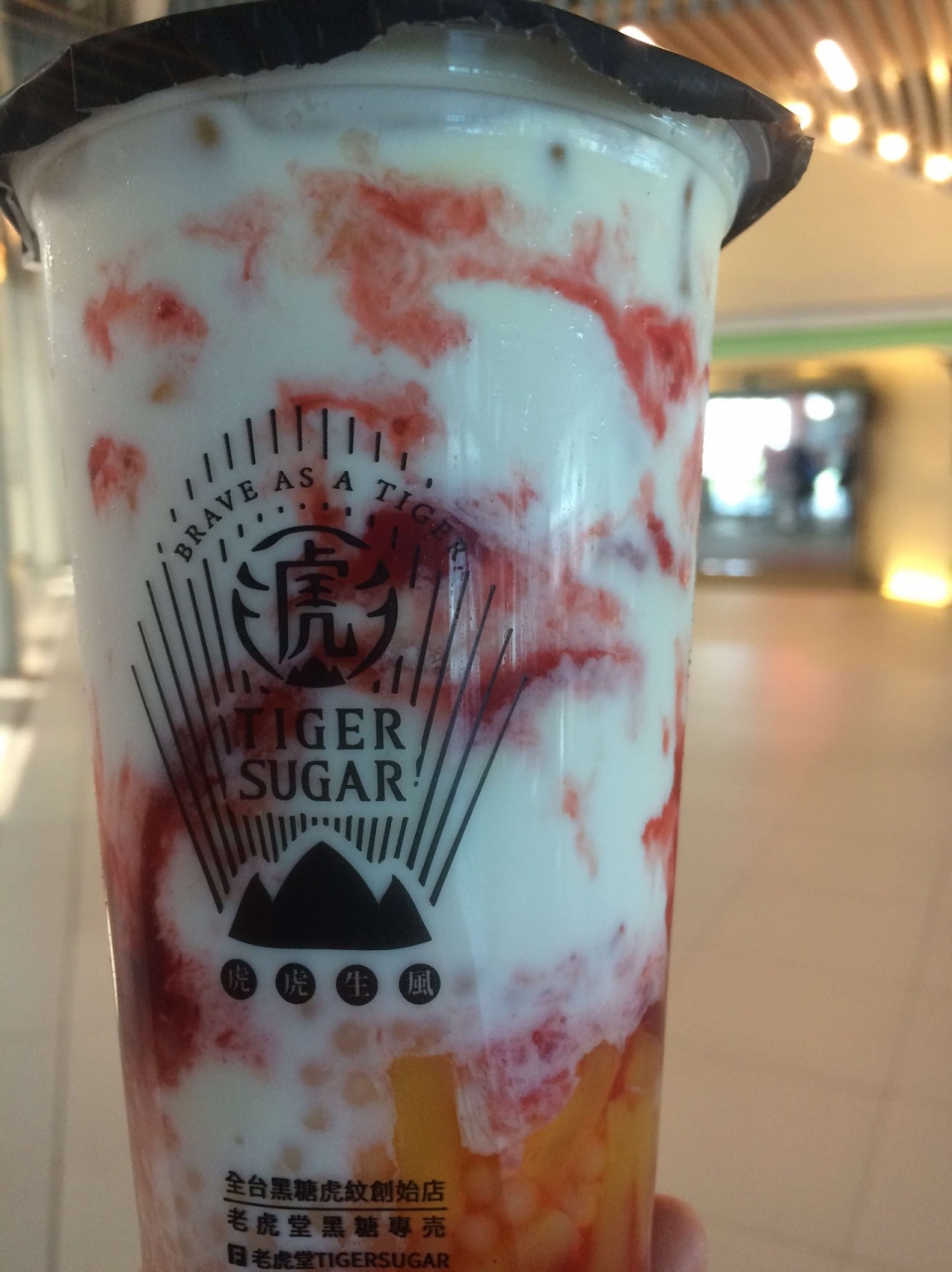 限定の苺大福味というのを買ってみたんですが、確かにストロベリーの色で赤くて可愛いのは間違いないんですが、味はそこまでおいしくなかったです。やっぱり定番のタピオカミルクティーが一番でした。虎の顔は浮き上がっていませんでした