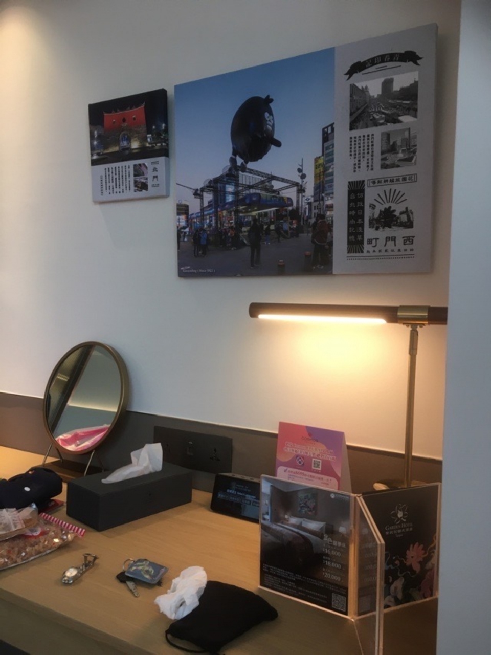 素敵なお部屋でした。ベッドの上のピローもいくつかあって、色も落ち着くグレーと白、黒メインのモダンな部屋でした。シャワーからお湯が結構でたので、気持ちよかったです。せっかくの素敵な部屋なのに西門の歴史みたいな写真は残念。