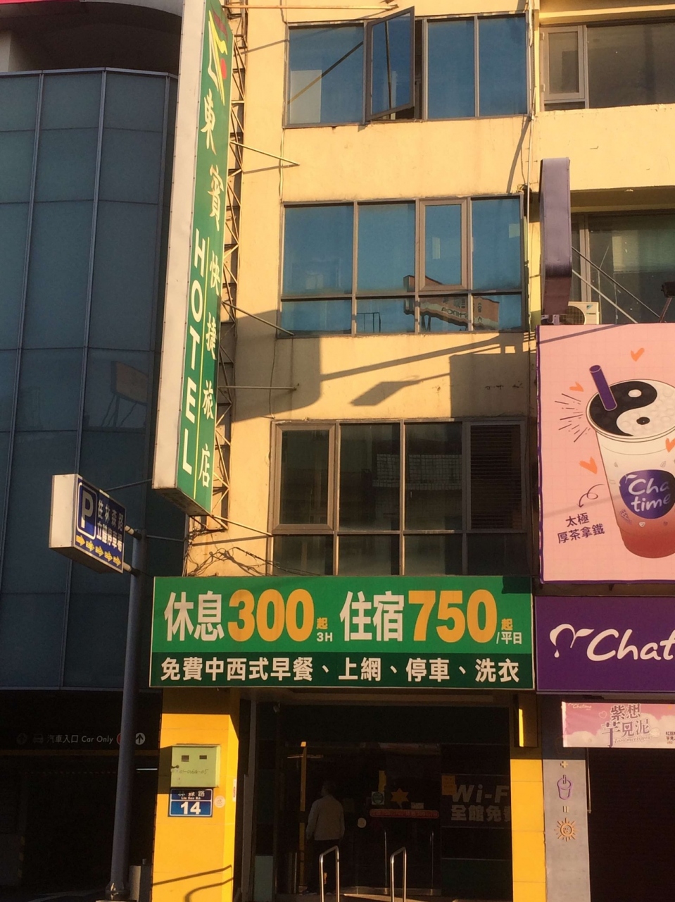 髪の毛の色が奇抜でしたが、若い男の子のスタッフの接客は普通に気さくで、気持ちよかったです。朝食は簡単なバイキング式で、台湾式のお粥とトーストがたくさん食べれました。部屋が禁煙なのに、外からのたばこの煙が入ってきました