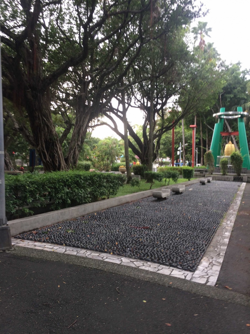 健康歩道は健康にいいのは分かっていますが、とにかく足の裏が痛かったです。丸い石はともかく結構とがったのもありました。健康歩道からは2本の大通りに接続できました。