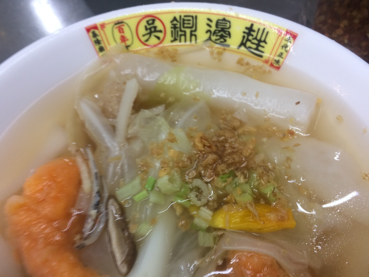 麺かと思っていましたが、実は糊状にしたお米を熱した鍋の淵に塗り、麺のように整えていくそうです。この麺みたいなのを台語で、呼ぶとこのお店の名前の一部と同じになるので、それがお店の名前の由来でした。スープは軽い塩味です