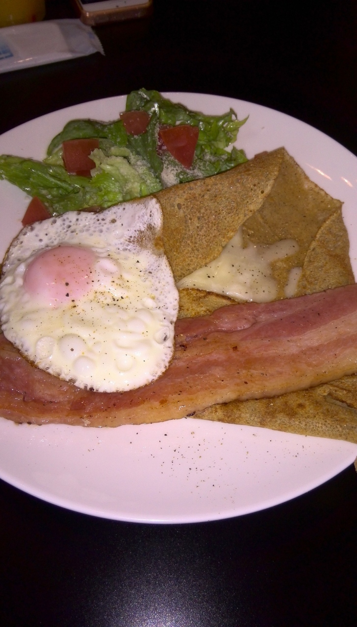 肉が食べたい方にお勧め。夕食を控えていたので、軽くそば粉のガレットにしましたが、ハンバーガーは大きくておいしそうでした。そば粉のガレットは3種類、サラダバージョン、生クリームバージョン(甘かった)、ベーコン&エッグバージョンです。3種類を4人で食べて結構満足。サラダはアボガドものっていて、豊富な野菜。クリームはとけるので、早めに食べましょう。ベーコンは肉厚でした。セルフでトレーなどは片づけます。