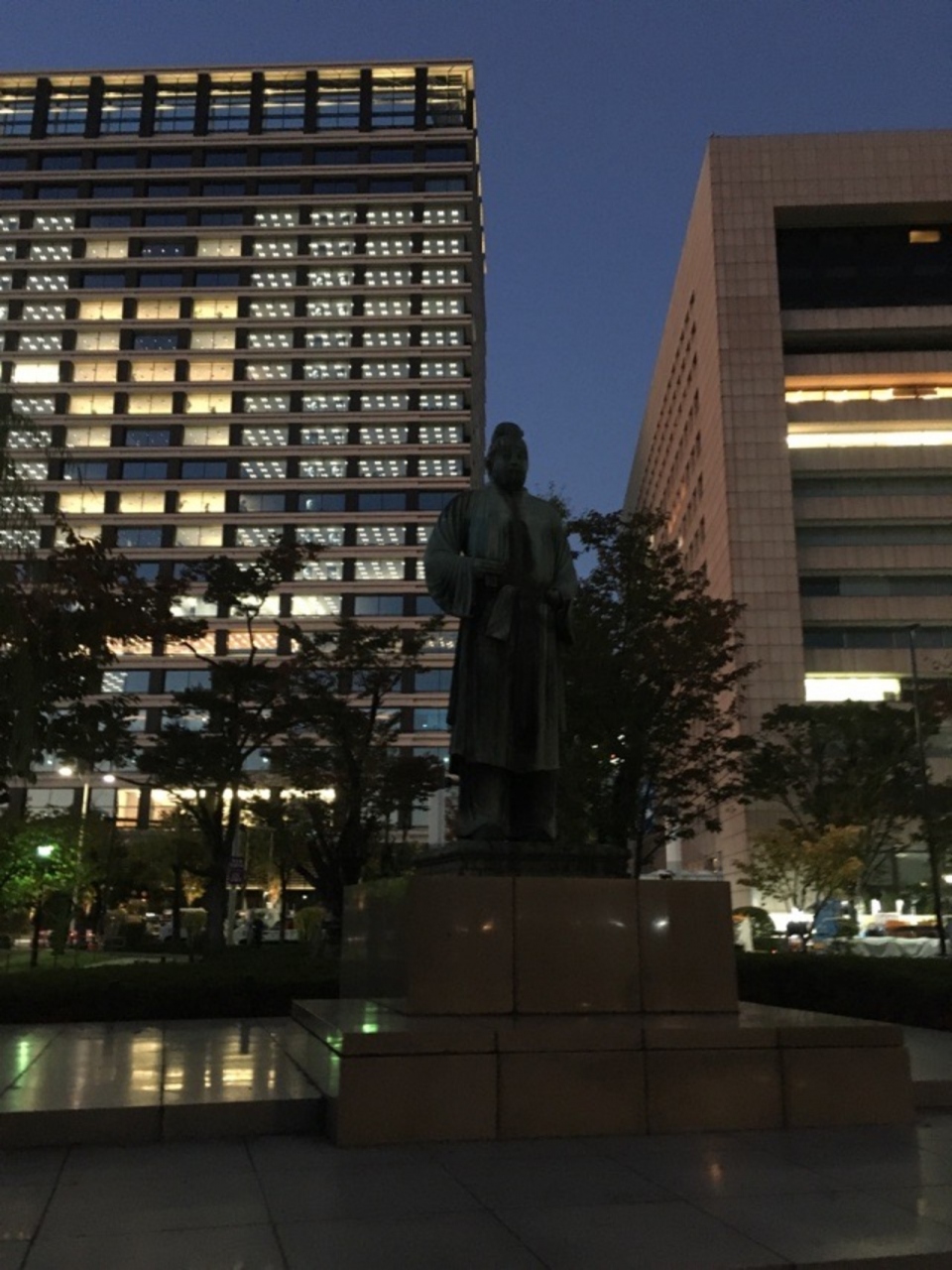 刀をさした人の銅像です。遣隋使か遣唐使の時代っぽい気がしました。皇居の周りの池、水堀を眺めて建っています。水鳥が泳いでいました。夕暮れ時に訪れたので、あまり顔立ちなどは見えませんでした。自宅に戻って調べて名前を知りました。