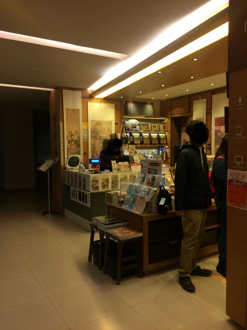 国立故宮博物院の中にあり、真っ赤な絨毯がひかれた中央の階段を登ってすぐのところにありました。大きくはありません。国立故宮博物院の主な展示のレプリカやポストカードなどがありました。キーホルダーも御約束でレジ前にありました