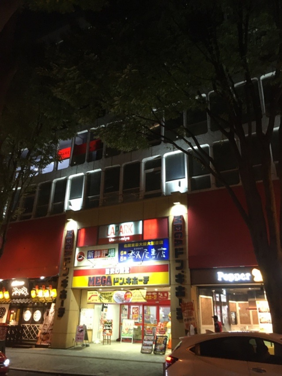 駅の目の前にあるロータリーにある白いぬいぐるみ?クマかなと思いますが、以前はブルーのマスクだったのが、クリスマスの時期は終わっているはずなのにクリスマスツリーと赤いマスクになって、サンタクロース風だったのが面白かったです