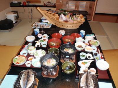 写真は夕食ではなく朝食なんですよ!朝から船盛りがついてるし、この品数すごいです!