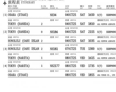 フライトスケジュールはこちら。往路は羽田で乗り継ぎ。復路は成田で乗り継...
