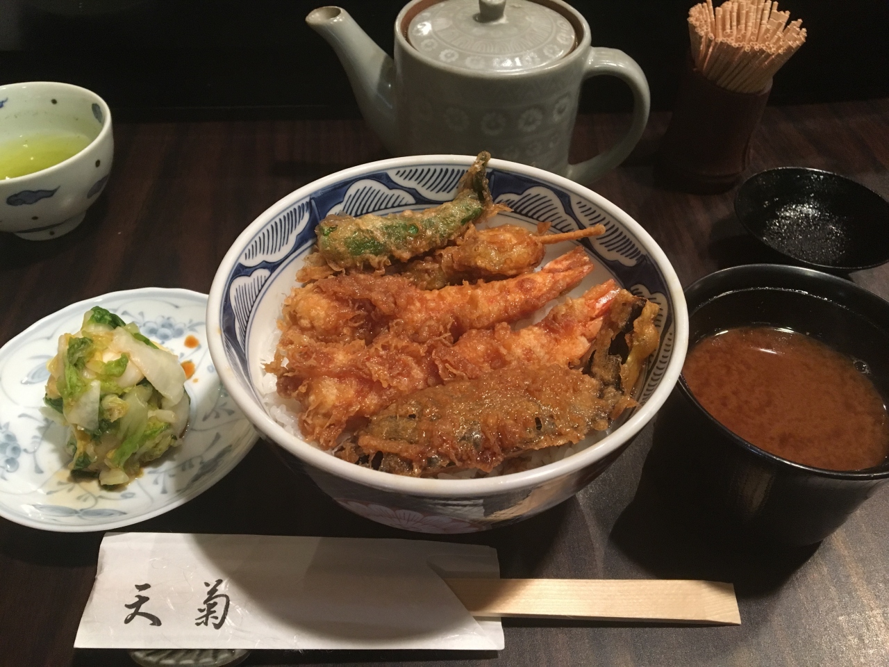 頼んだのは上天丼980円でした。海老2匹、なす、ししとう、玉ねぎ。おしんことあさりも赤味噌汁。