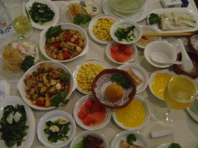 クコの実とトウモロコシの炒め物、白キクラゲのスープ、金銀花、紅花、ナツメなど小皿料理が20種類以上出てくる。これで値段は1000円ぐらいです。- 旅行時期