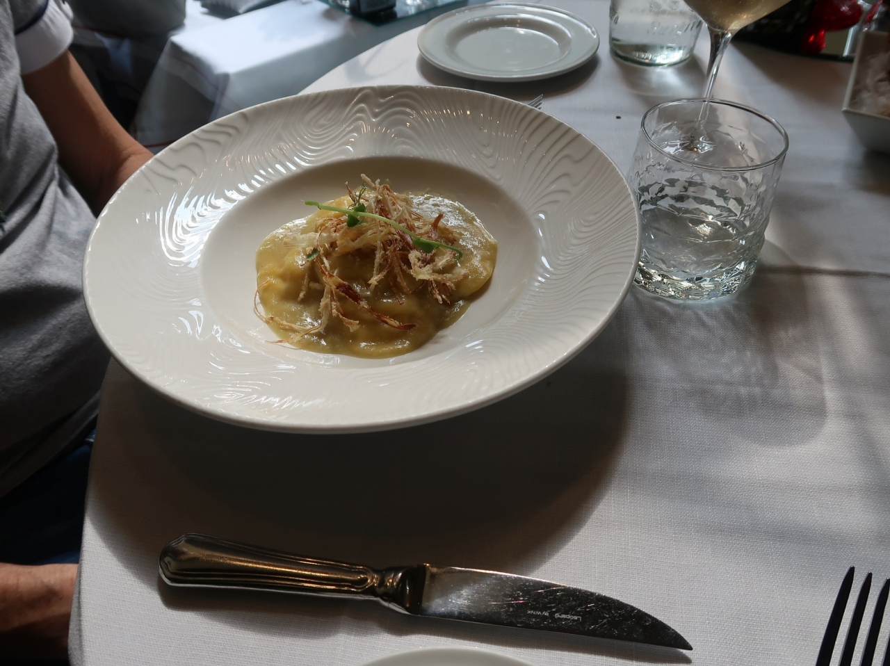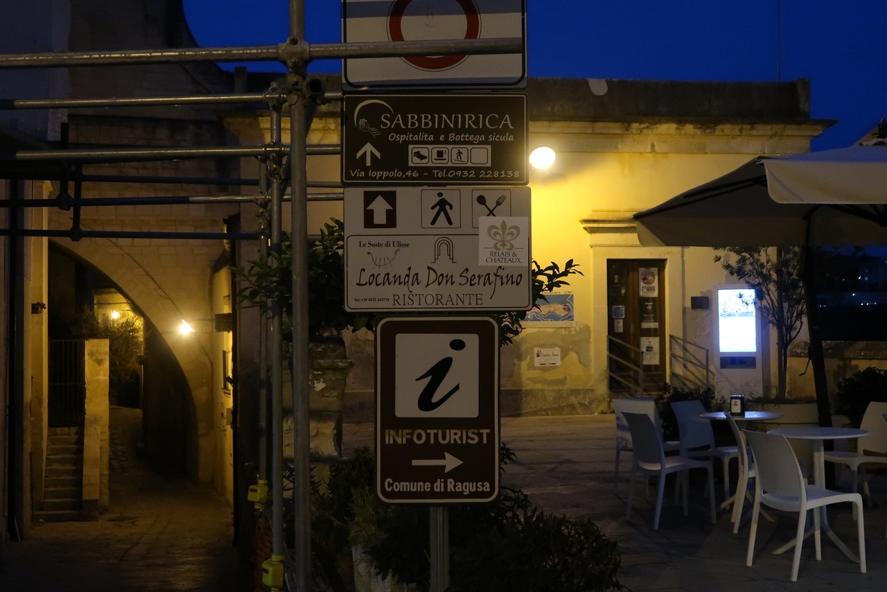 食べものが美味しいとされているラグーザの高級レストランのひとつ。友人の推薦で名前を知って夕食に行った。初めに同名のホテルに寄り、道順を聞きがてら席を予約した。ホテルより徒歩15分強。格式を考えると、予約を入れてスタッフにもおもてなしの心構えをしてもらった方がよさそう。私と前後して、叶姉妹のように着飾った日本人と思しき二人連れのお姉さまが入店したが、観光客といえども女性客へのおもてなしの態度は礼儀正しく素晴らしい。