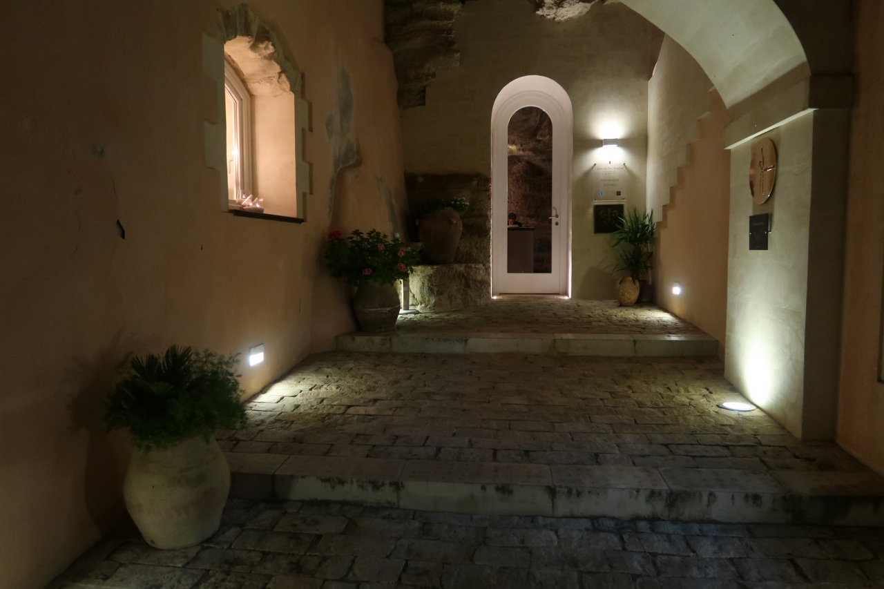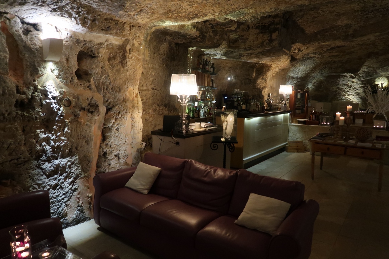 ここは、イブラのスーペリオーレ寄りにある同名のホテル、ドン・セラフィーノのレストラン部門で、現在地には2010年に移転したとの話。イブラ市街のある丘の崖下の洞窟を、教会から買い取って作ったので、内部は岩肌むき出し。インテリアは現代風で品よくしつらえてある。笑顔を絶やさずと優雅な動作で接客するスタッフ、なじみ客と、短くなく長くなく歓談して場を和ますホール・マネジャーの動きにヨーロッパ社交界の伝統の片鱗がうかがえる。