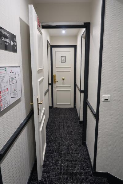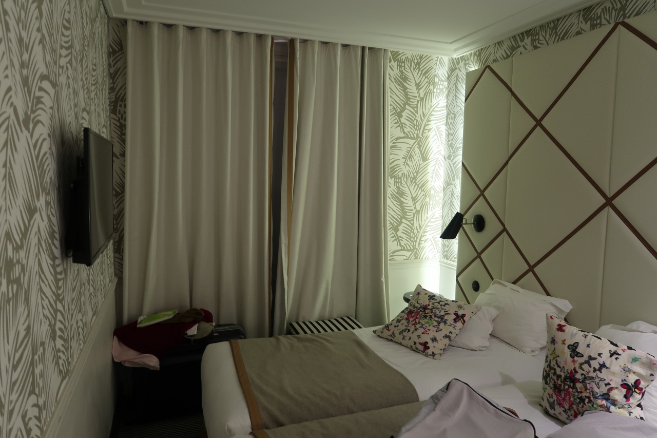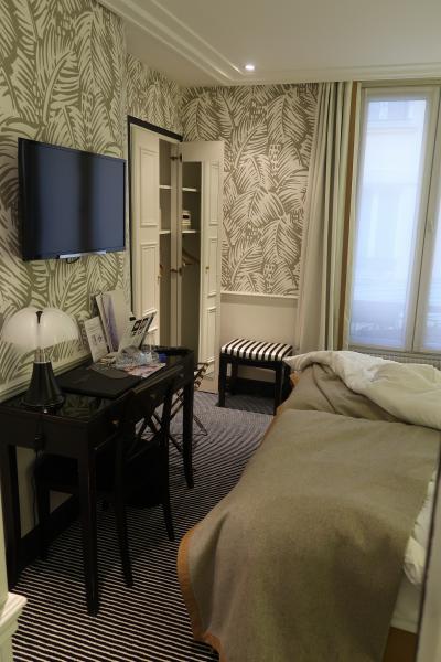 内装は、ロビー、サロン、部屋ともパリ風のシックな感じで、若い女性でも奥方でも楽しく過ごせるムードがある。やや難を言えば、全体に手狭なので、エレベーター、廊下も広いとは言えないし、スタンダードの部屋もベッド脇のスペースがほとんどない。