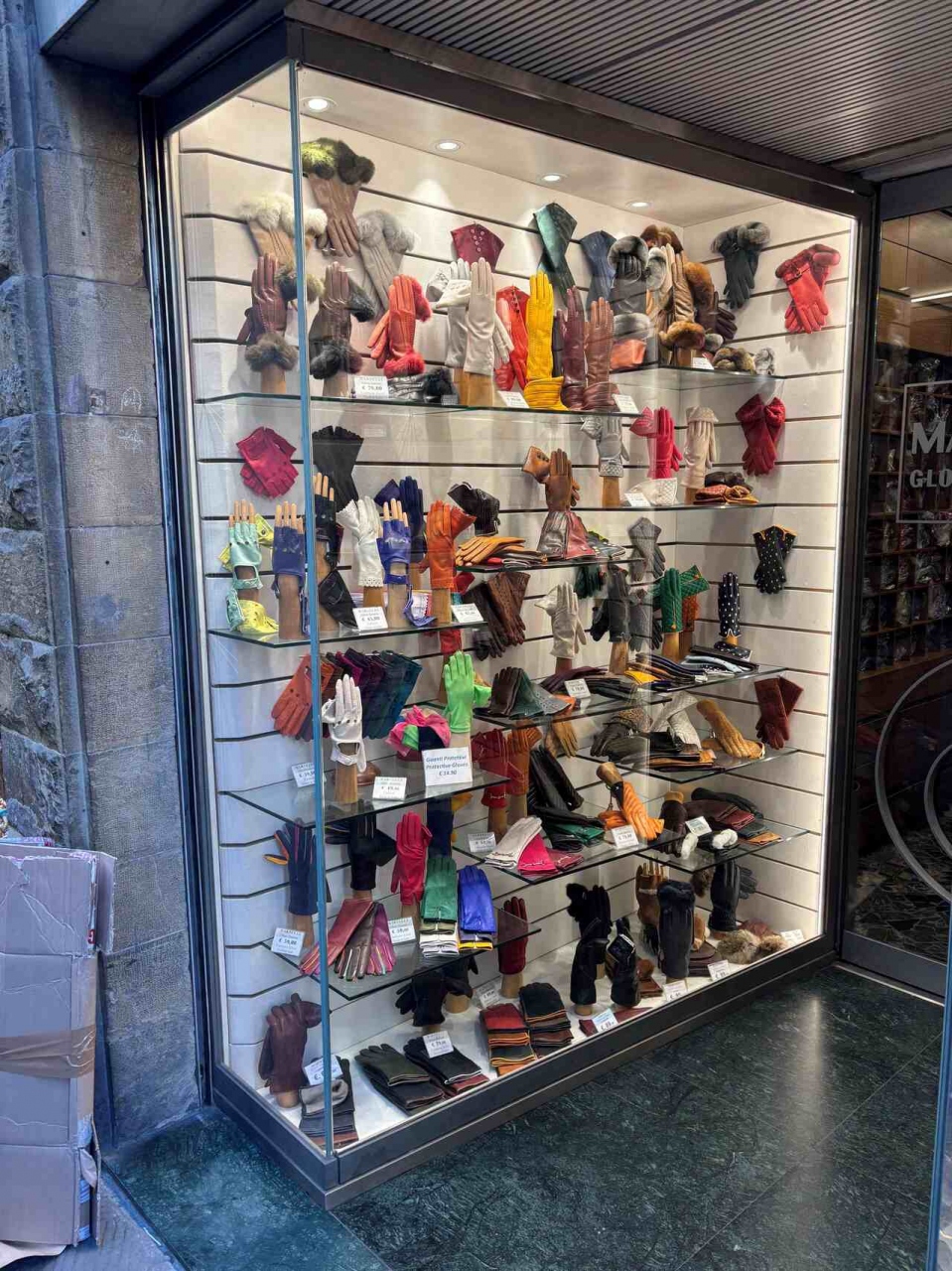 マルテッリ:Martelli、は他のお土産を買っているうちに店員さんから推挙されて寄った。きちんと作られた質の良い手袋が、それに見合う価格で手に入る。だいたい50ユーロから150ユーロくらい。素晴らしいのは、日本では考え付かないか、売らないような派手な色合いの手袋がいっぱいあること。私はシニアなので「馬子にも衣裳」と、赤系統の手袋を買った。玉に傷は、お店のスタッフがやや「売らんかな」態度で、ちょっと面倒くさそうな仕草を見せる時があること。オーバーツーリズム気味の大勢の観光客をさばいているうちに、お店のプライドを忘れて慢心したのかも知れない。これからも、もっと良い商売をしてほしい。