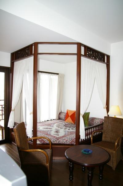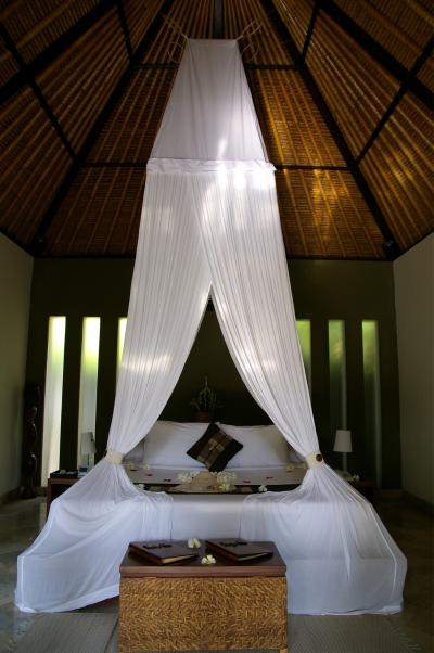 お部屋のインテリアは、ナチュラル&モダンの融合です。ベットには高い天井からロマンティックな蚊帳がかけられており、うっとりしました。