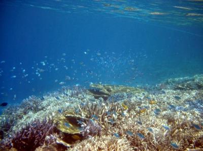 サンゴも浅瀬の部分はずいぶん傷んでいますが、奥へ行くとサンゴも綺麗になり、魚影も濃いです。10mくらい沖に行くと、ドロップオフになっていて、ホワイトチップシャークや、ハタをはじめ大物の魚がたくさん居ます。
