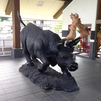 火牛、角にたいまつ、火がついた大きなオブジェは圧倒されます。火牛で兵がいっぱいいるとカムフラージュ?する作戦で、源平の戦いで実際にあったお話だそうです。近くには入浴施設などもありますし、お土産屋さん、農産市みたいなものも開催されているみたいです。