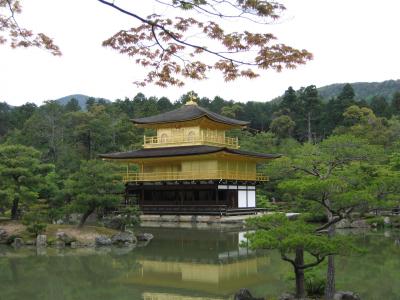 とにかく金色に輝く建物が特徴的です。別棟のふすまや茶屋など、金閣以外にも時間を過ごせる場所はありますが、どうしても見とれてしまいます。池に映る姿も金色だし、まわりの木々の緑と、金閣の金色は意外とマッチングがよく、美しさを強調していると思います。