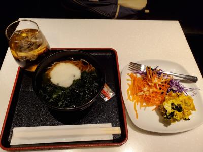 本日の夕食①お蕎麦と野菜です。ラウンジ内はそれなりに混雑してました。マ...