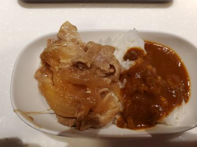 本日の夕食②カレーに生姜焼きをトッピング。深夜便なので乗ったら寝る予定...