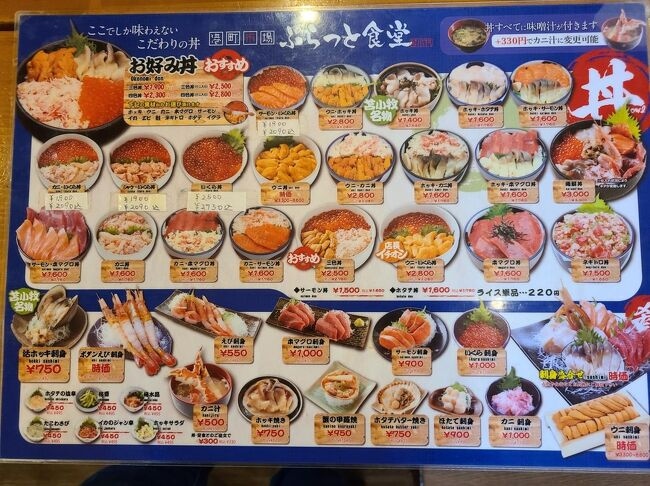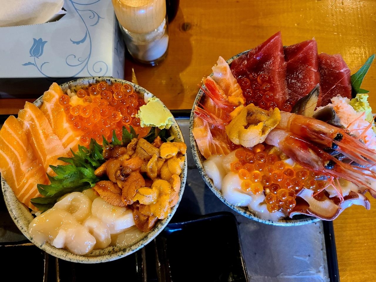 春休み期間の平日、ランチ時に訪問しました。失礼ながら、同じ敷地内にあるお目当ての店に断られたため、第二候補のこちらにやって来ました。ネット情報では70席あるそうですが、直感的に店内は広く確かに座席数も多かったです。私は3,300円の海鮮丼、連れは四色丼3,520円(ウニ・ホタテ・サーモン・イクラ)をオーダー。本来、ウニ入り四色丼は3,080円なのですが、ウニが不漁ということで通常より440円上乗せされていました。感想としては鮮度も良く美味しかったですが、価格を考慮すれば期待レベル程度という第一印象でした。しかし、観光客向けで昼時に並ばずに着席でき、従業員の接客などを踏まえれば、総合的には期待以上の水準だったと思います。