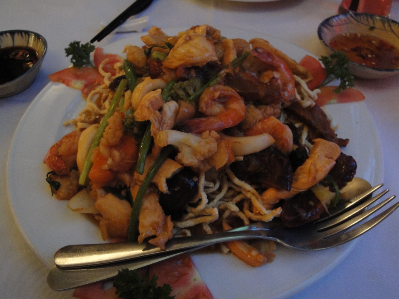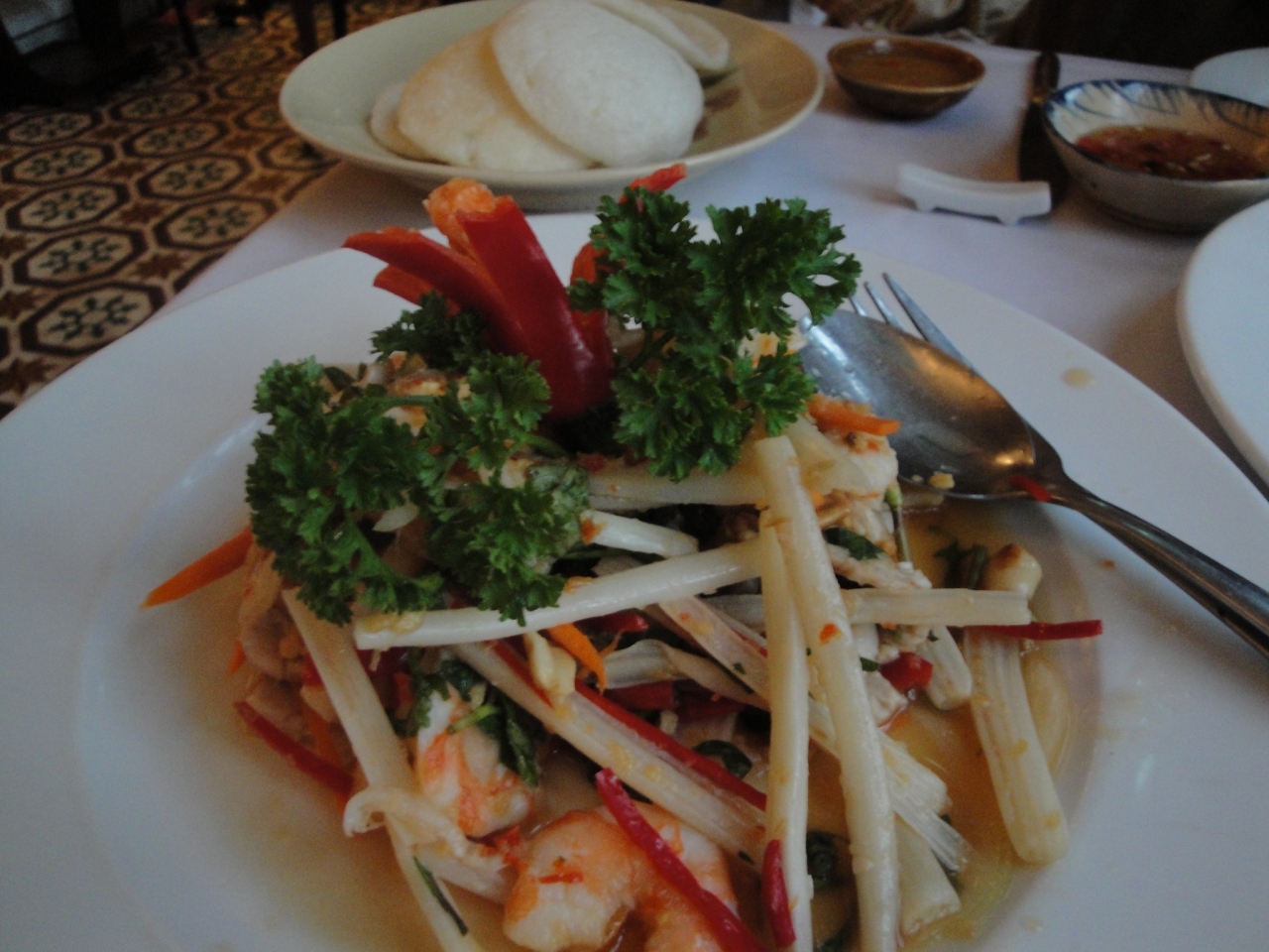 私たちは女性2人で、ゴイクン(海老の生春巻)、かぼちゃの温かいスープ、チキンのサラダ、テンプルクラブ風やきそばを注文。