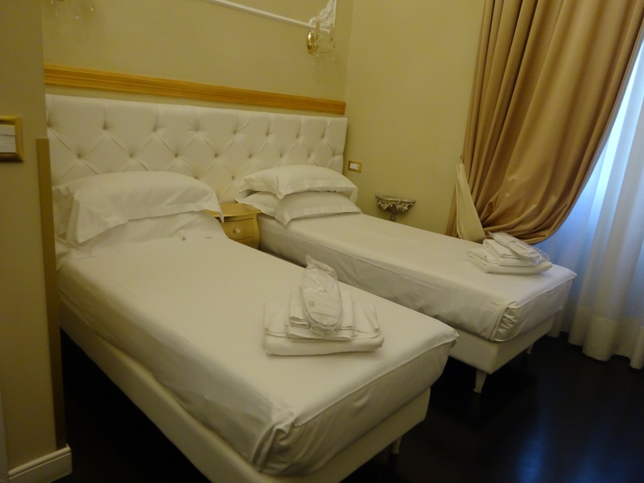 道路のベルを押すとキングスマンの人がロックを解除してくれました。B&Bにはフロントが無いとか色々書かれていましたが、ここにはフロントが有りましたが常時誰かがいるわけではないようです。5部屋位有ったように思います。カードキーを受け取って説明を受けて部屋に入ります。ドアを開けたら明るい室内。天井が高くて4か5メーターくらい有りますかね。広々とした感じで綺麗だしテンション上がります。希望通りのツインルームのベッドの上にはタオル類とスリッパベッド脇には電源コンセントとUSBの差込が有ります。設備も整っていて快適です。朝食もボリュームが有って美味しかったです。Booking.comの評価が9.6って凄いです。またフィレンツェに行けることが有ったら是非泊りたいです。