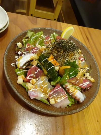 ホテルでお勧めを聞いて向かった『さかなばたけ』。靴を脱いで入るタイプのお店です。丁度第一陣が出払ったところで空いていました。いつもなのかは分からないけど突き出しが枝豆なのは嬉しい。お刺身の盛り合わせにしようか悩んでサラダを選択しましたが、お刺身たっぷりでよかったです。黒板に季節やその時のお勧めが有るのが嬉しいし、四国名物も有ってホテルの方お勧めなのが良く分かります。