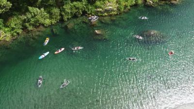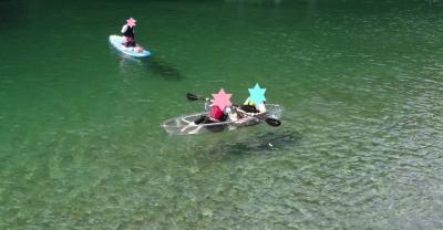 体験はインストラクターさんの説明でパドルの使い方を教えて頂いて川に進みます。クリアカヤックに乗るときは揺れてちょっと怖いけど川の流れは緩やかでシニアでも大丈夫です。お子さんとペアで乗っている方やSUPにワンちゃん乗せている方もいました。川底まで見えるので浅いのかと思ってパドルを差し込んでみたけど全く底にはつかない。