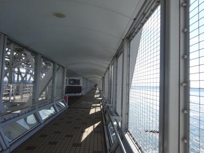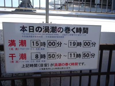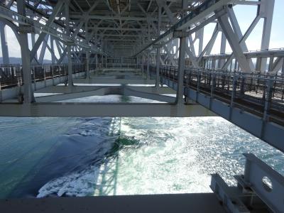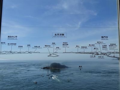 渦潮を観るには時間も大切です。もちろん事前に確認済みです。時間が早いせいかコロナウィルスのせいか空いていますね。通路の窓からは太平洋側などの説明が窓に貼ってあるので景色と共に見えます。橋の鉄骨がそのまま観られるので凄いところを歩いているのが実感できます。ガラス越しでも渦巻いているのがよくわかります。観光船が渦の中に向かっているのが目の前で見られて結構近くに感じられました。ガラスの床が何か所か有りましたが展望室の真下は一段と渦巻いていますね。船酔いせずに渦潮を観られて良かったです。