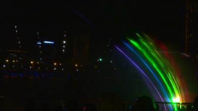マリーナベイサンズに宿泊して2度目にして鑑賞!始まる40分前頃に行って見ると夕涼みがてら既にチラホラ陣どっている人たちが居ます。どの辺りが良く見えるのかよく判らないままに座ってみます。円形噴水に映像を映し出すあたりが面白い。途中でシャボン玉が飛んだりして思いがけないことも有って楽しかったです。音楽と映像が見られるでイベントプラザで見るのが良いなと思いました。