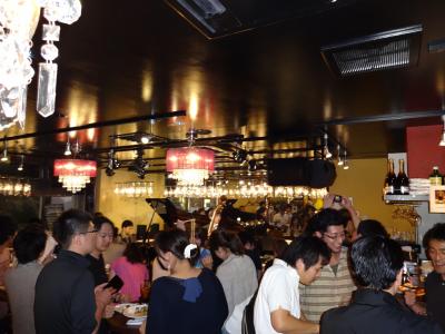 店内はかなりぎっちりした感じです。立ち飲みスペースは小さなテーブルを囲んで食べますが一皿が大きくてボリュームが有るのでかなり狭い感じです。座れる席はソフォーで6人座ると身動きできない感じに見えます。私たちは4人だったので余裕が有りましたがワイン2本飲んでもうこれ以上は無理です、と言う程食べても5000円未満で飲み食いできます。料理に当たり外れは有るようですが全般的に激安で美味しかったです。席の予約は月1回1日のみらしいので予約で一杯なので取るのは難しいそうです。運が良ければ店頭で他の日にも予約が取れます。