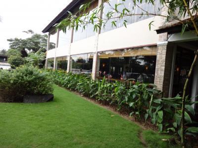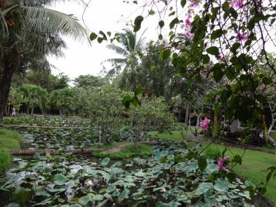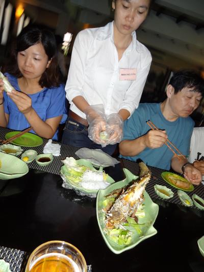 ツアーのランチで行きました。入り口の案内する人達は白のアオザイにパールのネックレスの制服でした。エレファント・イヤー・フィッシュが既にテーブルにセットされて名物料理を見せるために立てて有りました。食事は全般に薄味でタレや薬味などで調整するので食べやすく美味しかった。お庭もきれいに整備されていて天気が良ければ散策したかった。