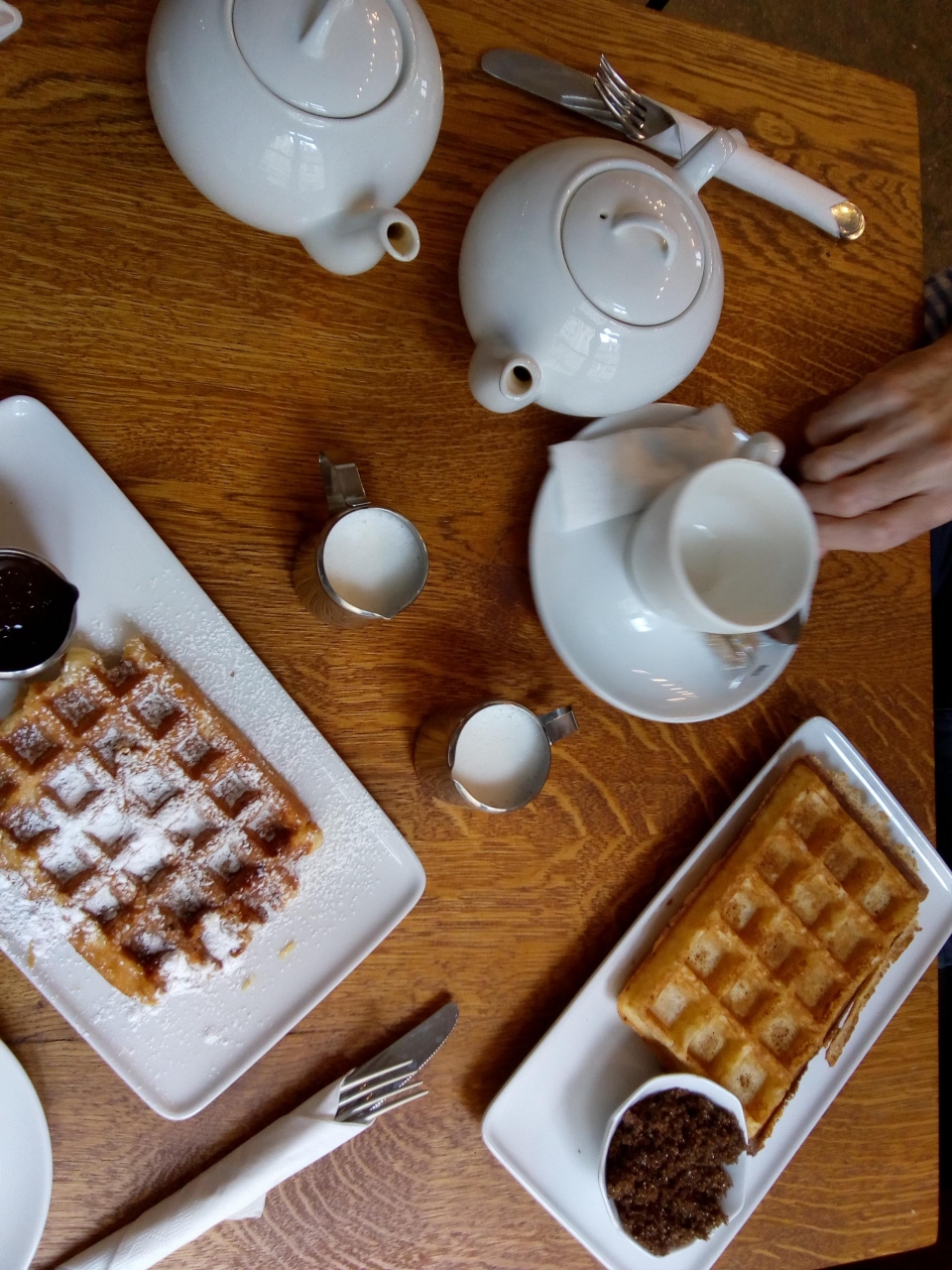 数あるワッフルのお店の中でも老舗のお店ということでこちらをセレクトしました。種類が多くて選べませんでしたが、二種類のワッフル生地を夫と別のものをたのんでシェアしました。テイクアウトの人もいっぱいいましたがせっかくなのでティールームでゆったりといただきました。