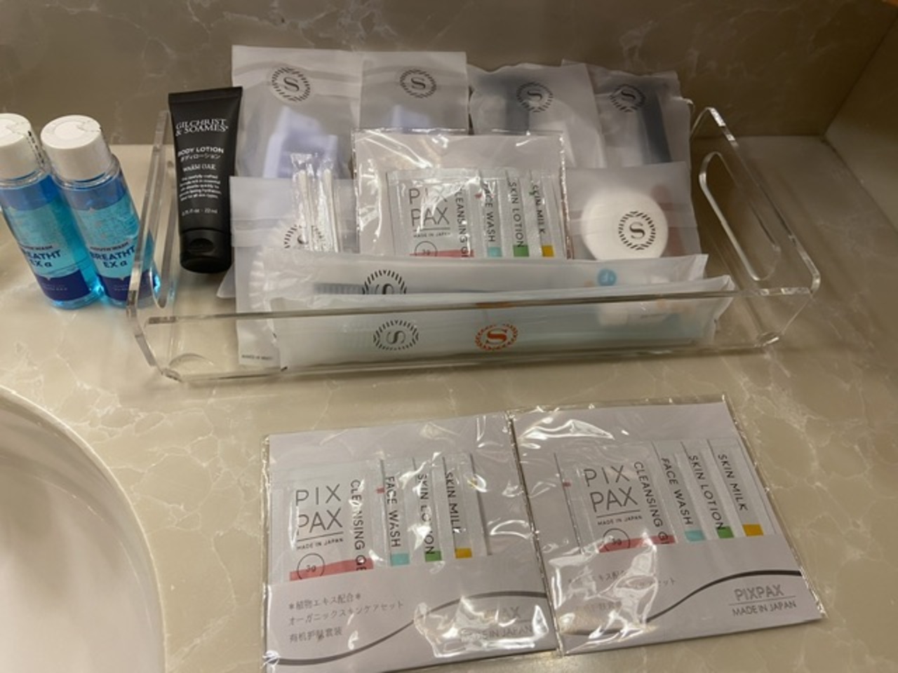 アメニティが充実しておりフェイスパックも有ります。ウエルカムドリンクとして室内冷蔵庫のドリンクが1回分ついています。