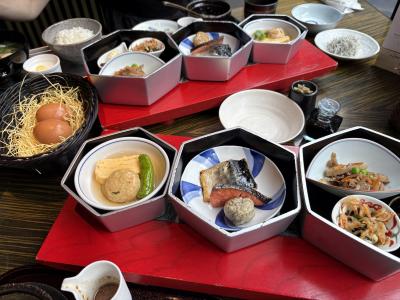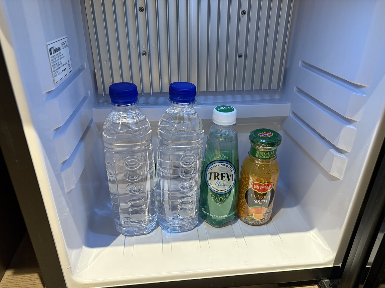 部屋の冷蔵庫内 ミネラルウォーターと炭酸水 オレンジジュースも無料です。500ポイントの代わりに朝食2名分を選びましたが、とても充実していておすすめです。エッグスタンド、ヌードルスタンドがあります。鮑ご飯や、鮑の丸ごと醤油煮等も有ります。