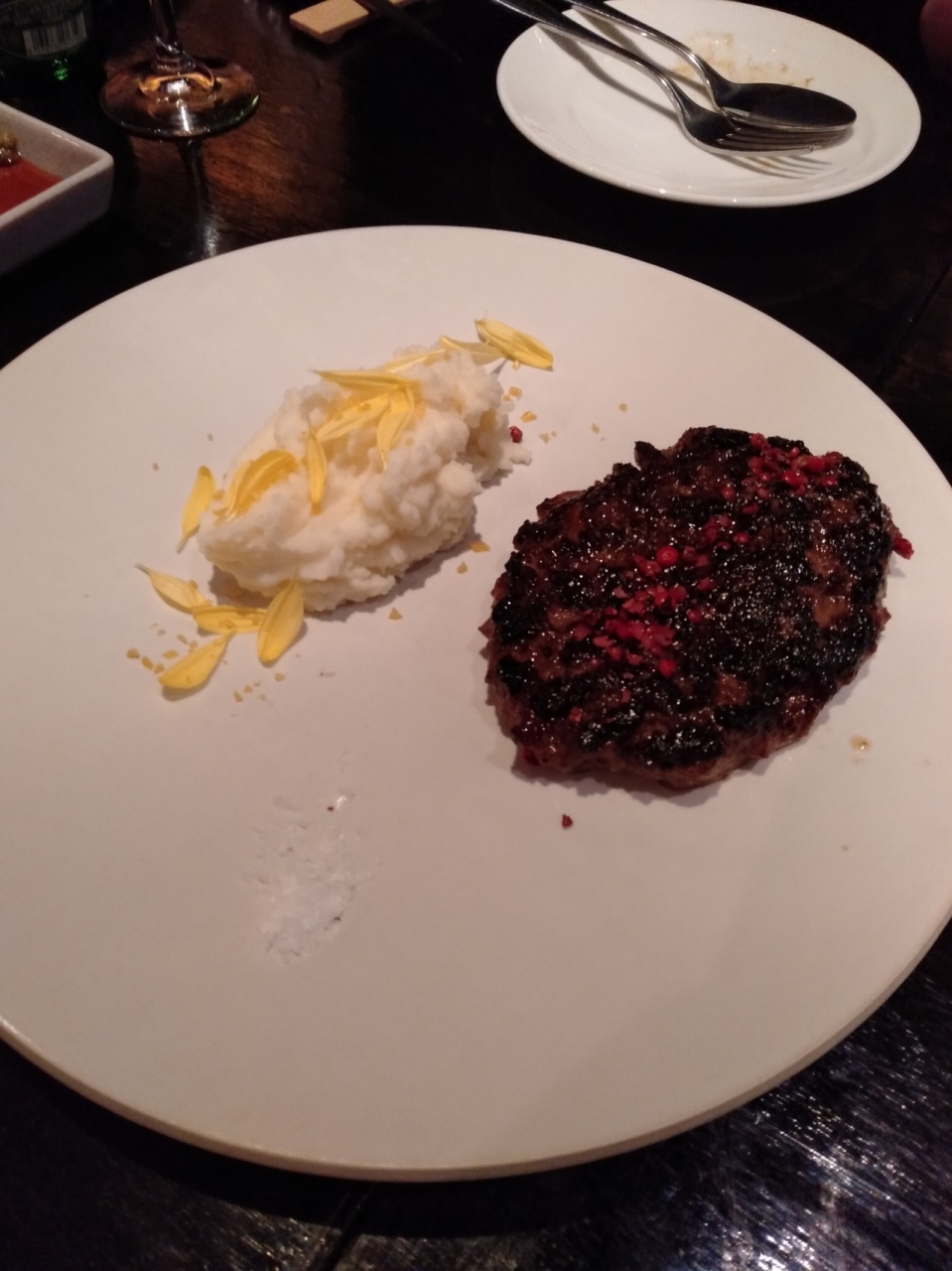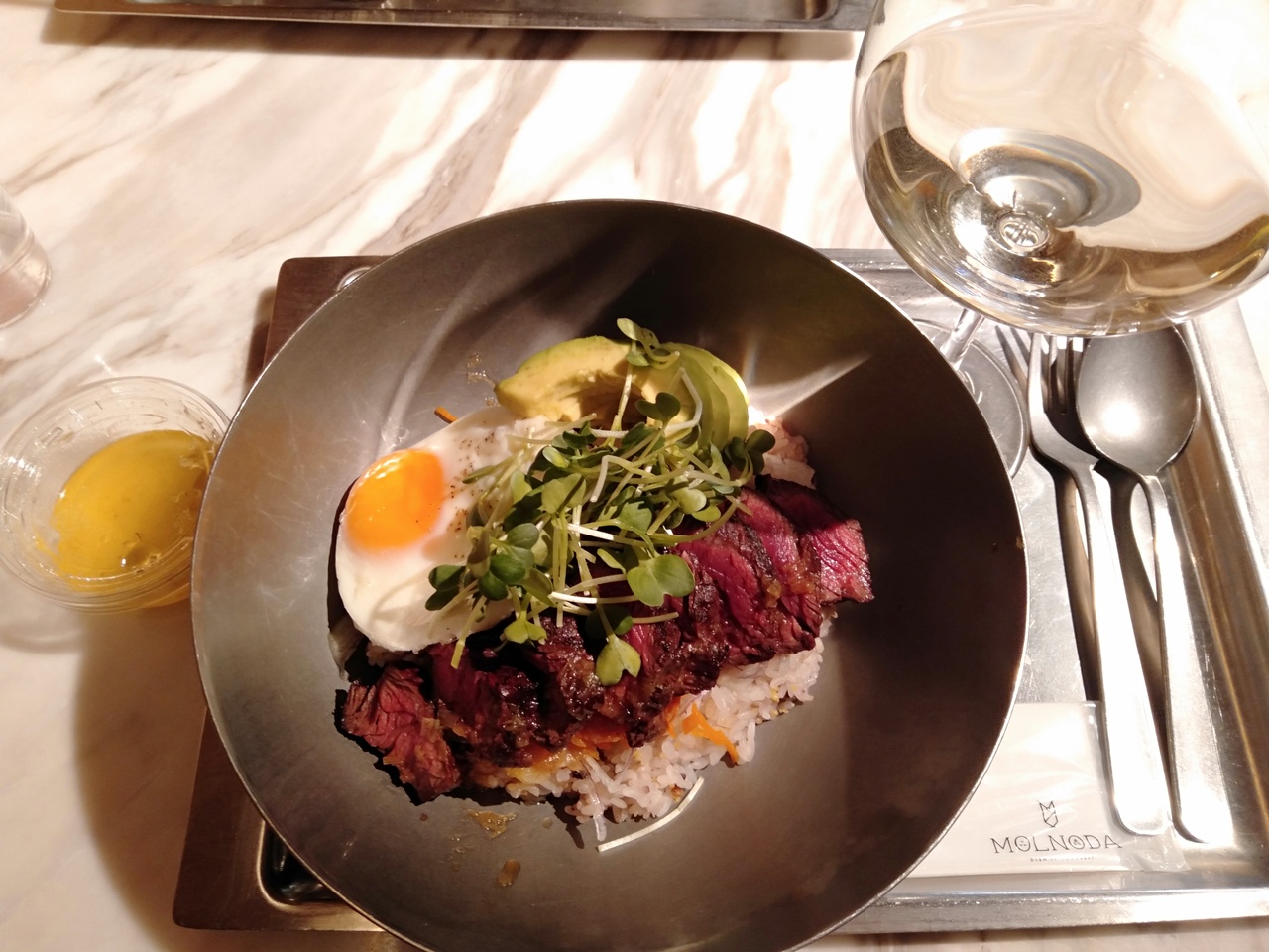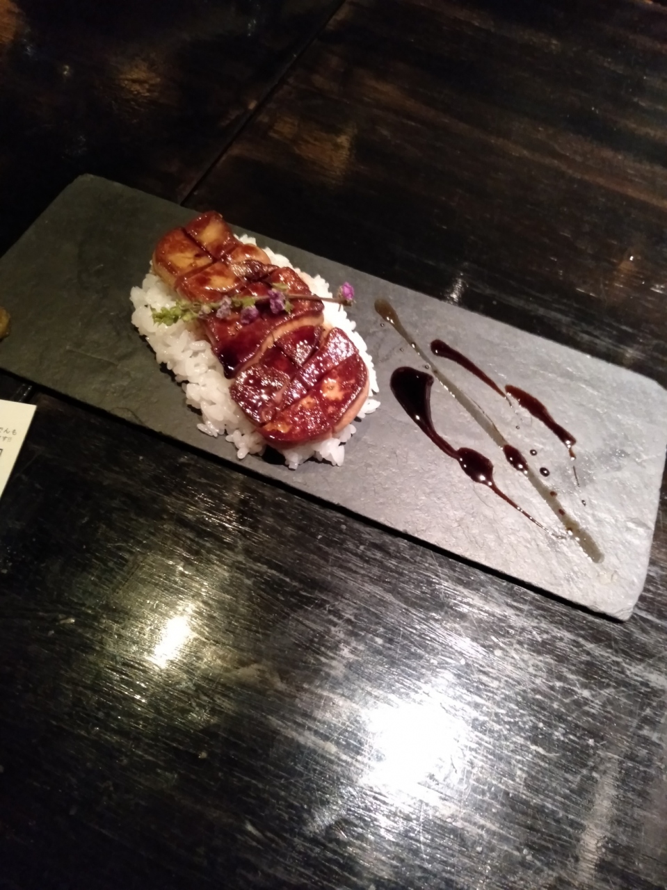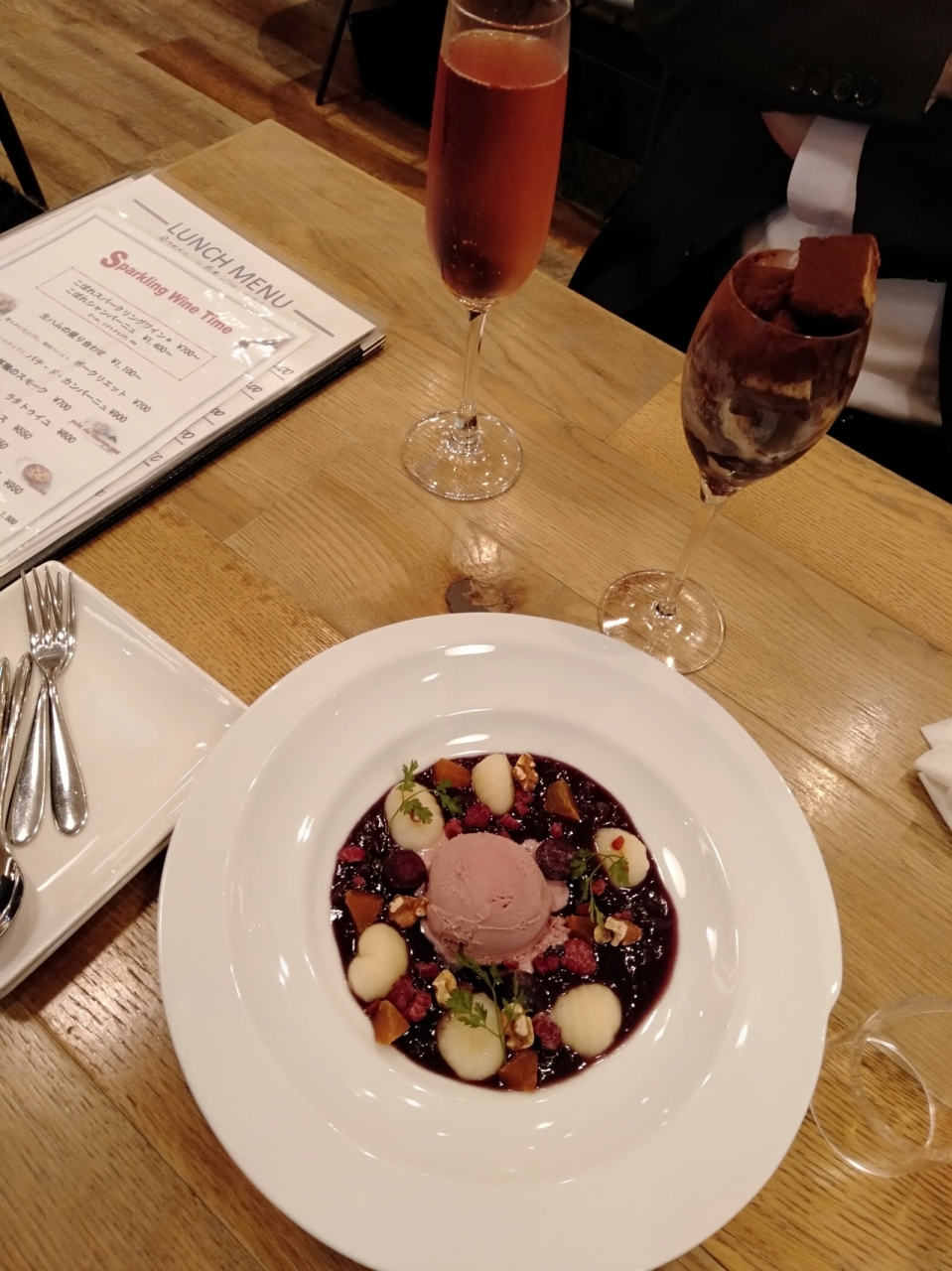 ランチ時に行きましたが、他の店舗に比べると比較的空いています。名物のこぼれシャンパンを注文しましたがスタッフさんがうまいこと表面張力ギリギリまで注いでくれるのでこぼれません。一品はお手頃でまぁまぁの味です。デザートの洋風ぜんざいはあんことベリーが混ざっていて、餅の代わりにニョッキが入っています。