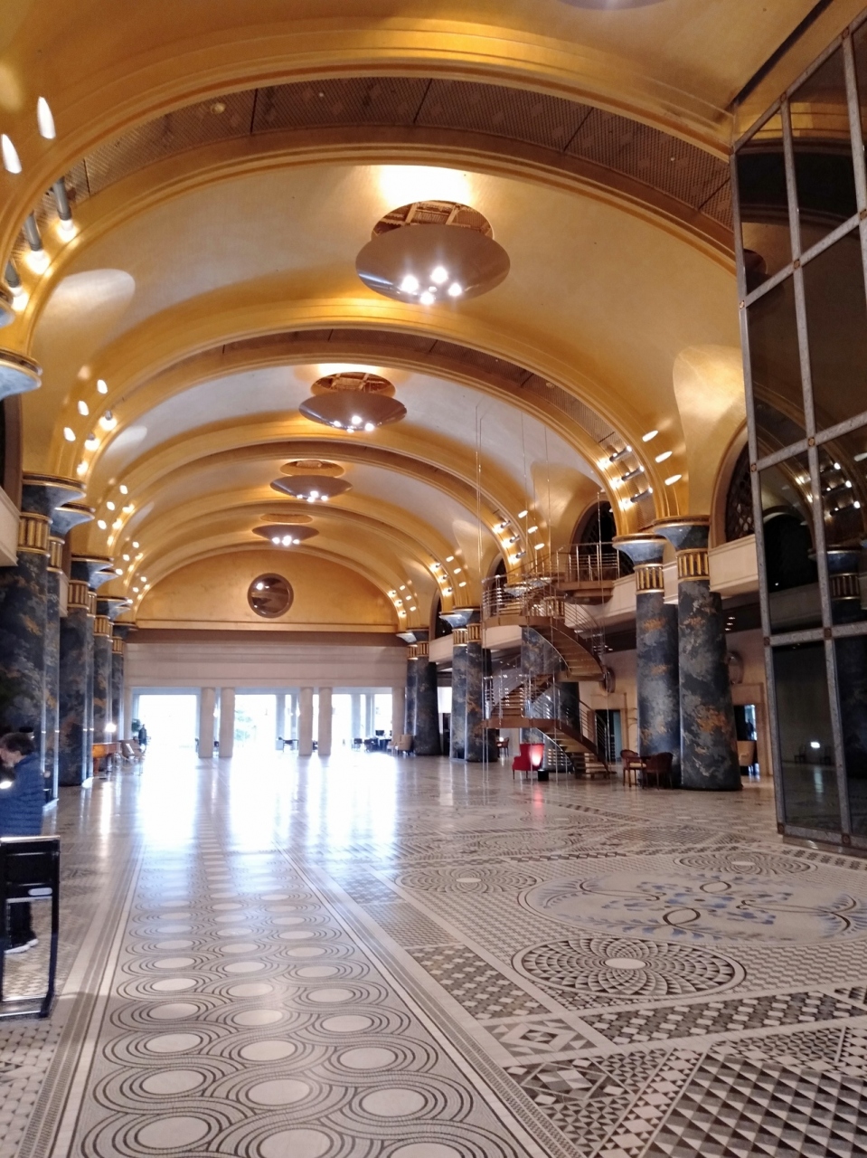 南紀白浜駅から送迎バスで約15分、一際大きくそびえ立つ西洋のお城風ホテル。ロビーは天井が輝くゴールド、床はモザイク、贅の限りを尽くした内装。チェックイン後、ラウンジへ、スイーツやチーズ、お酒が揃っています。客室も広々としていて、海へと張り出したガラス張りの浴室は開放感があります。こちらにはワインセラーがあって予約をすると見学可能です。100年前のワインなどもありディナー時に飲むこともできます。王様のブッフェと言われるブッフェは品数豊富です。