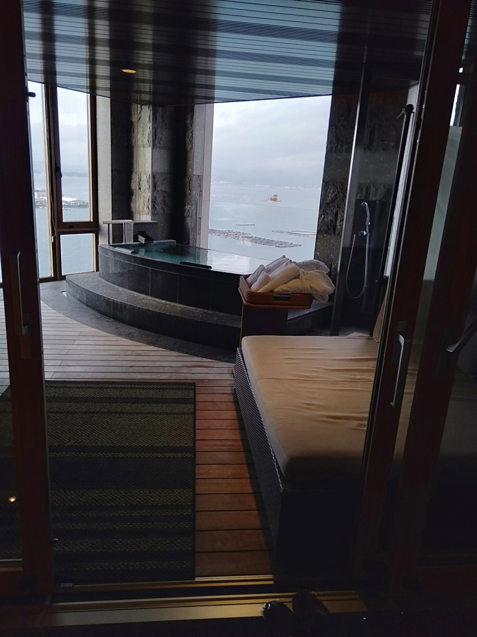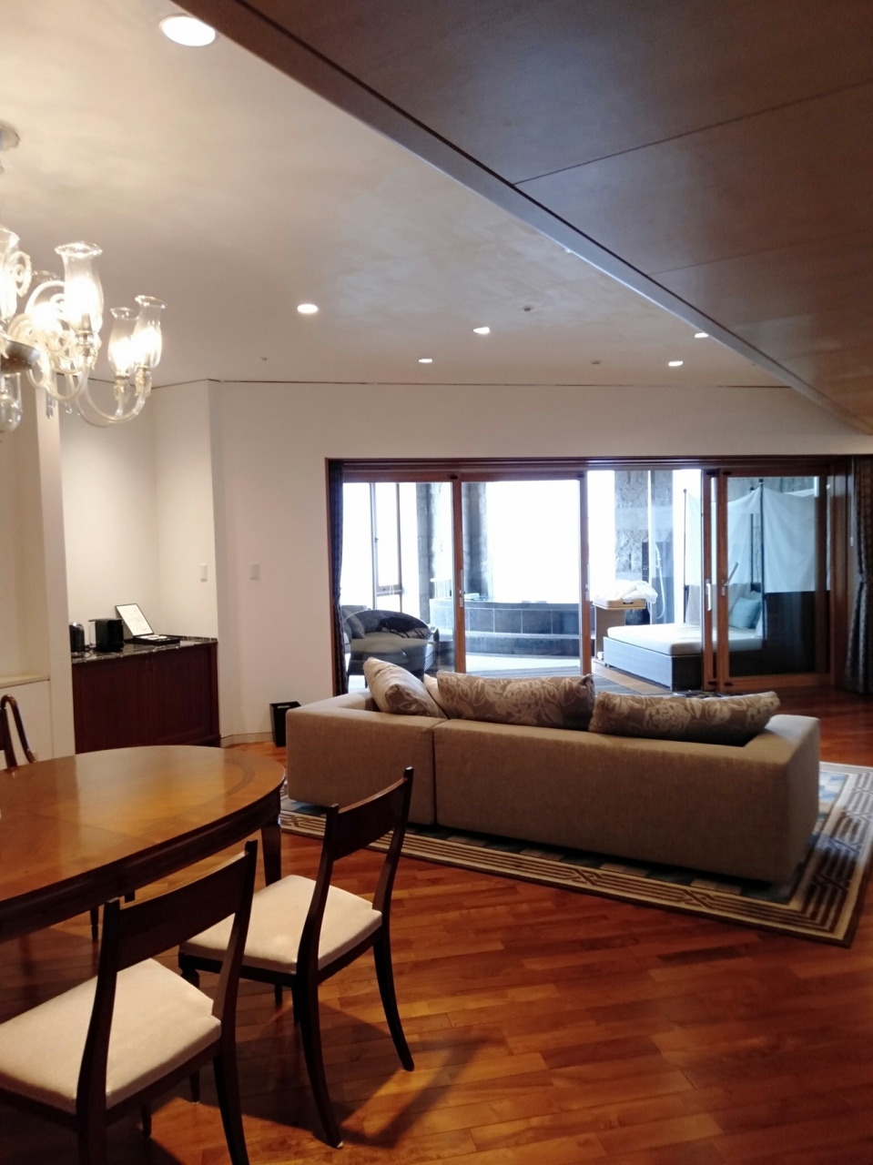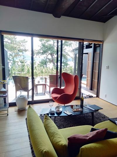 天橋立駅から送迎バスで約15分。フロントにはウエルカムドリンクとスナックが並んでいます。全室スイートですが、一番高いお部屋には皇室で使われるトイレットペーパーが備え付けられています。お部屋は海に面していて、金と銀の天然温泉の露天風呂があり、温水プールも付いています。お部屋は申し分ないのですが、周りには何も無いので夕食、朝食と隣のリゾートマンションのレストランに行かなければならずここのお料理の味が普通なこと、そのマンションが部屋のプールから思いきり見えてしまうのが気になります。