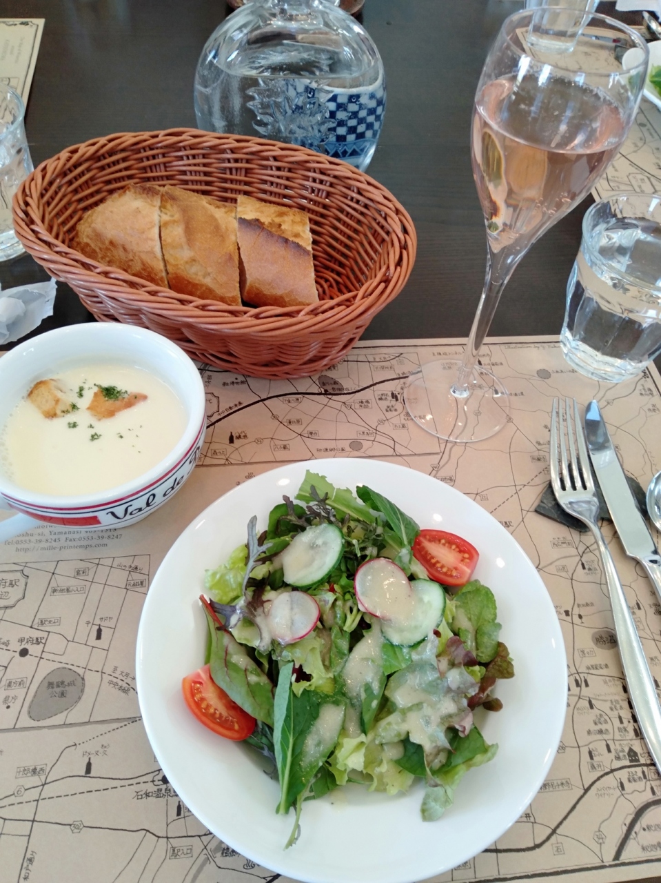 外観はこじんまりとした西洋風。ランチセットはサラダ、パン、スープ、メインです。味は全体的に素材の味を活かすためか薄味というか、印象に欠けます。ワインは地元のワイナリーからセレクトされていて、こちらは好みでした。