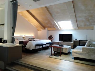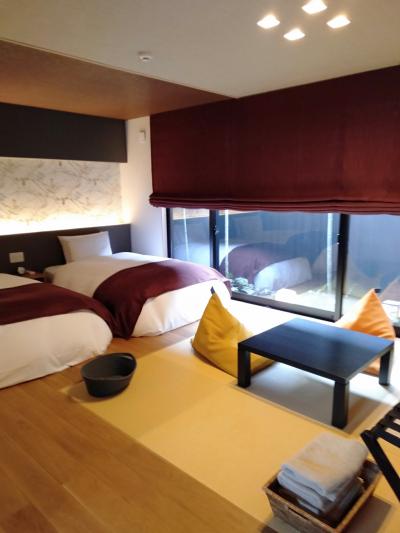 人通りの多い祇園界隈から北へ徒歩10分、落ち着いた場所にひっそりとある新しいホテル。内観は和を基調としたスタイリッシュなものです。部屋はロフト付きで1階にバスと洗面台、2階にミニバーとベッドです。プロジェクターなど、面白い仕掛けもあります。スタッフの方は若くて、まだ慣れてないような感じも感じられますがとても気持ち良い接客です。