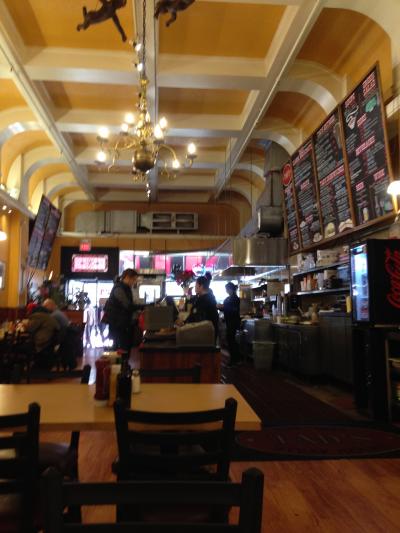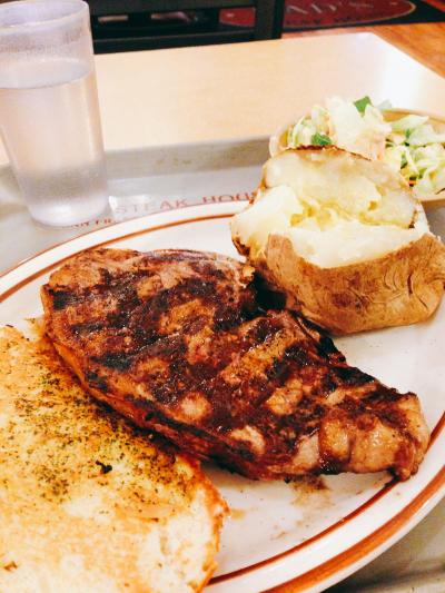 アメリカに来たからには一度は食べておきたいステーキ。一人ではレストランに入りにくいのでこちらのお店にしました。入口を入ってすぐレジがあり注文します。ステーキにはサラダとポテト・パンが付いていました。サラダのドレッシングと焼き加減を聞かれます。水は無料でセルフです。赤身の肉は柔らかく値段の割に美味しかったです。チップも要らないので気軽に食べられるお店でした。