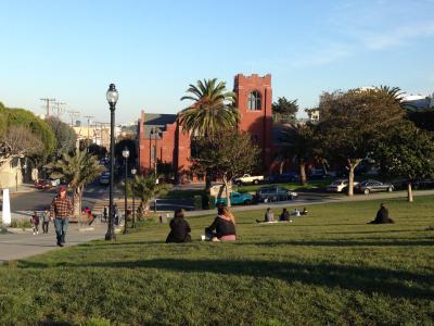 近くのお店でアイスを買って立ち寄りました。坂が多いサンフランシスコならではの丘の上にある公園なので眺めもいいです。きれいな芝生の上にゴロゴロしている地元の人たちを見ているのも楽しい。ワンコ連れも多かったです。